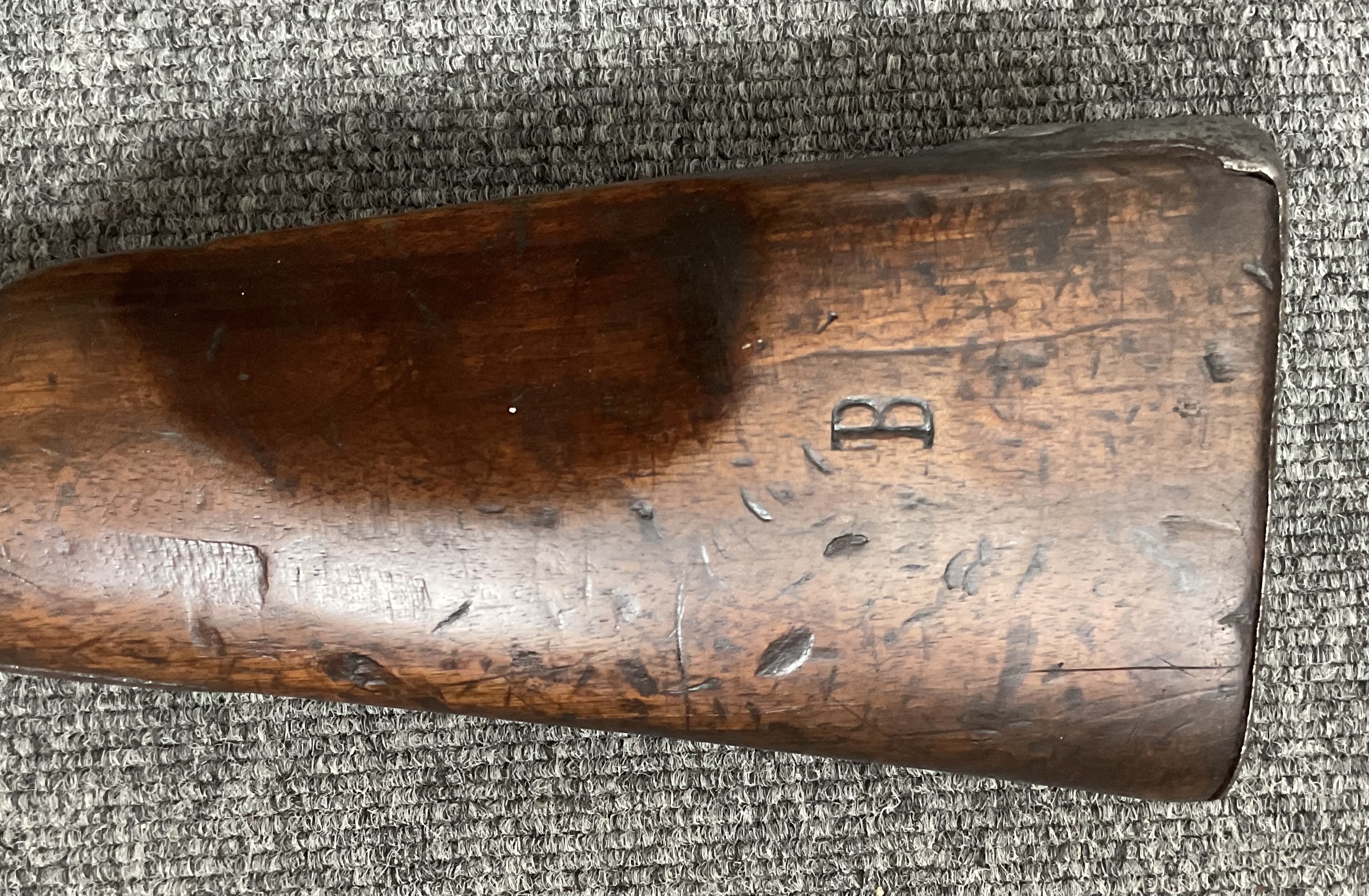 3-Band smooth bored 42-inch barrel. Steel butt-plate and ramrod, brass pan. Stock stamped 'B'. Top of barrel stamped 'M1815'