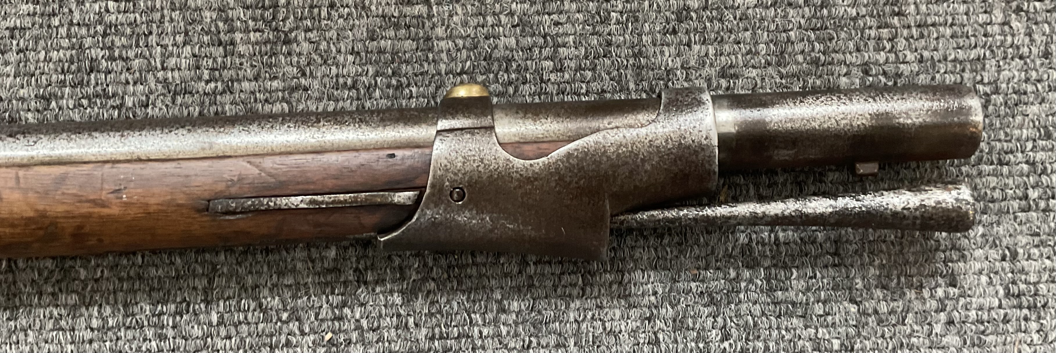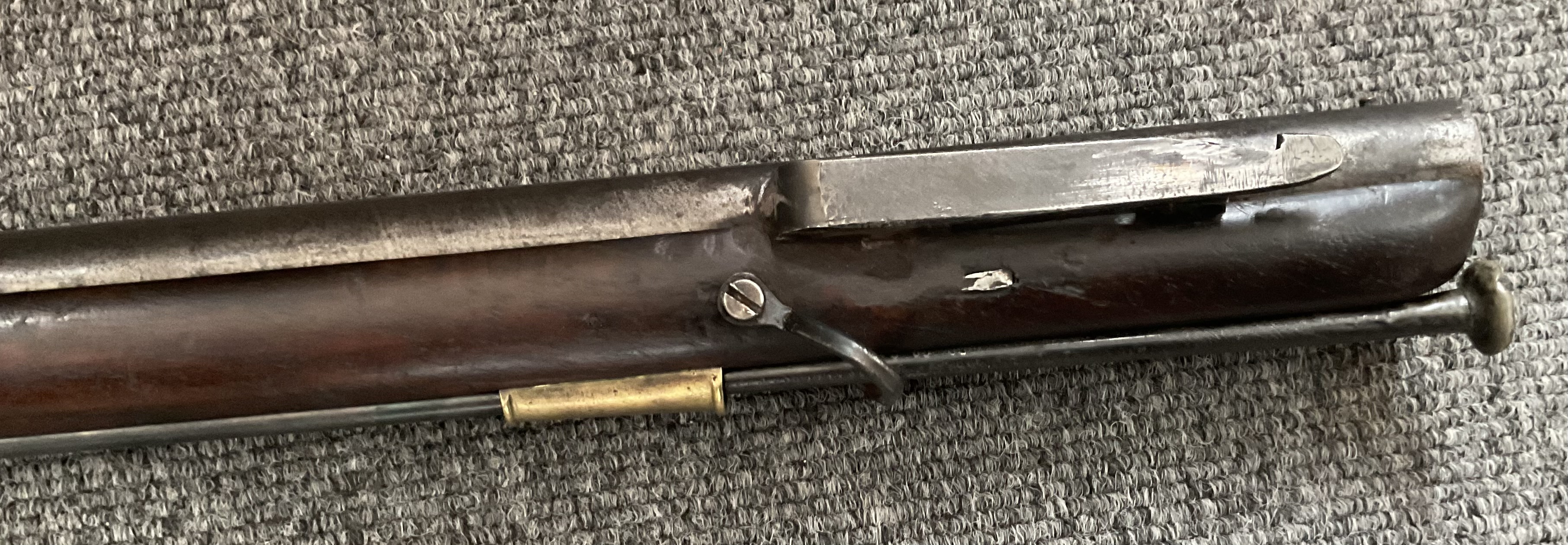 butt plate. Steel ramrod. 31-inch smooth bored barrel. Has fitting to attach bayonet.
