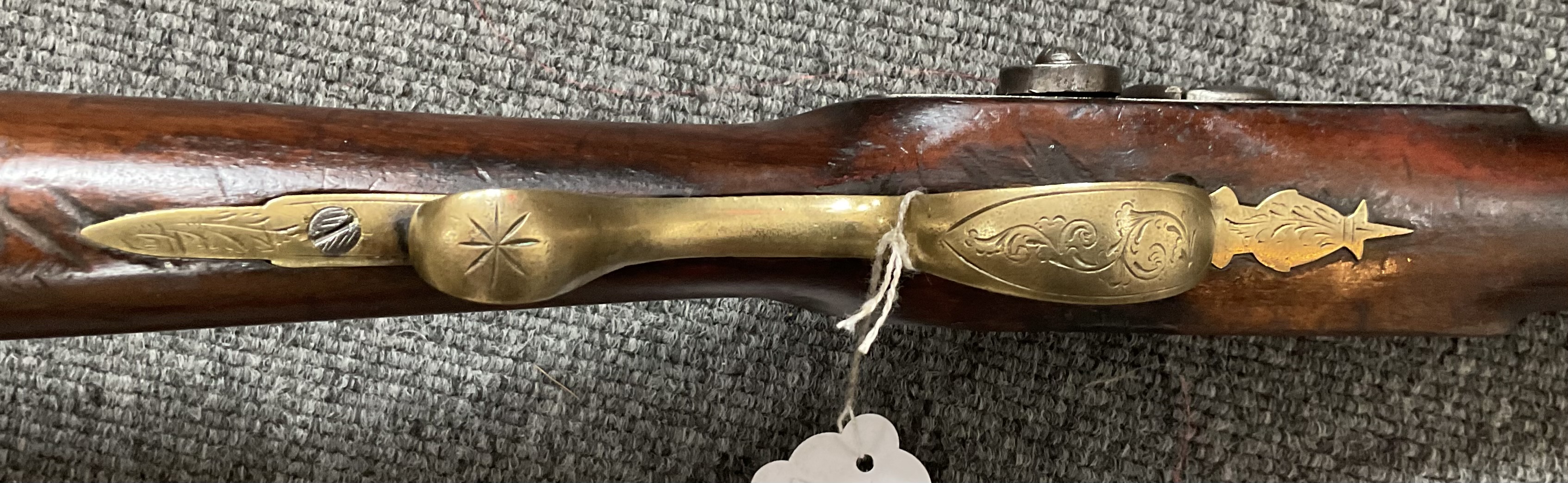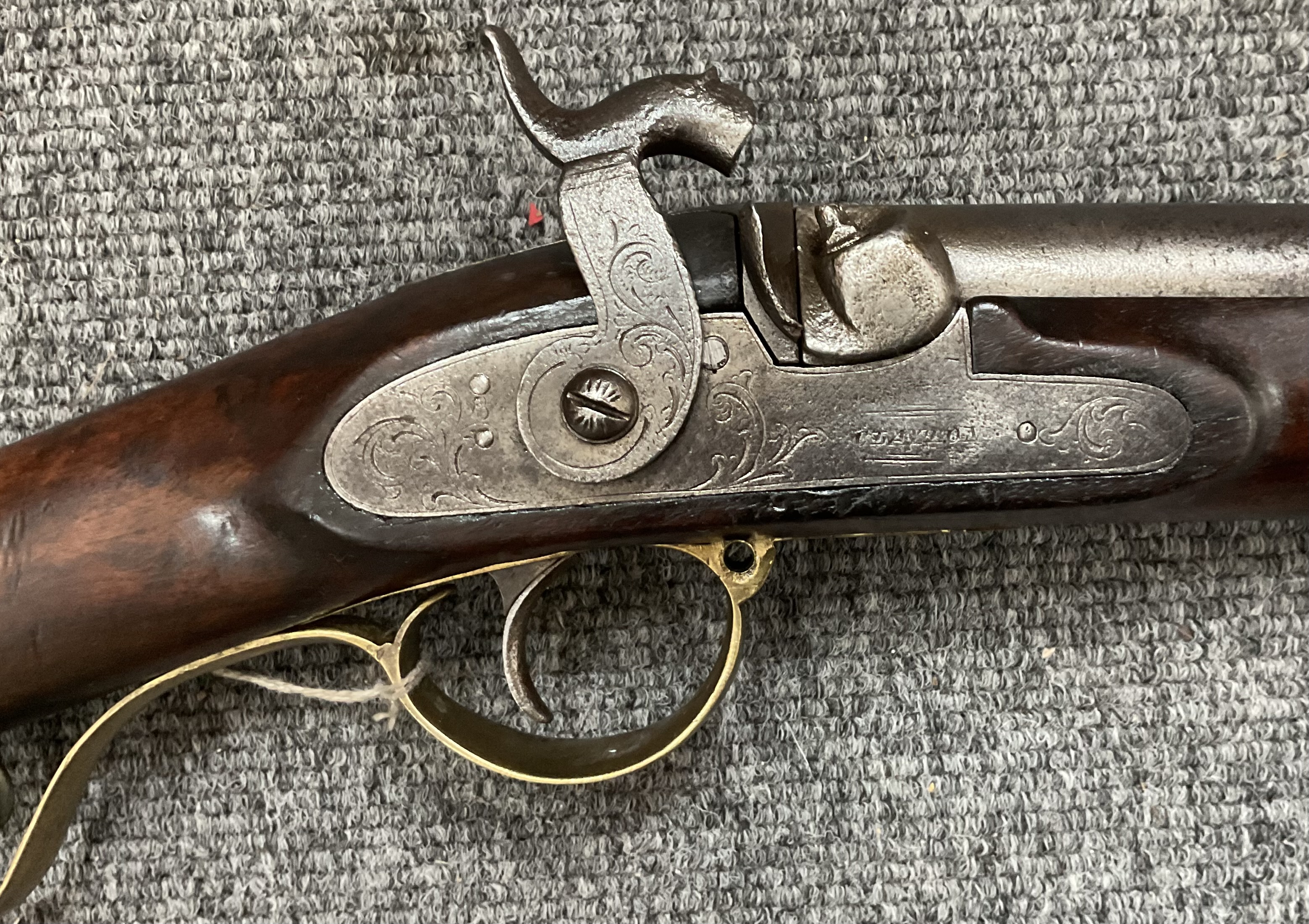 engraved lock, engraved hammer and scrolling on brass trigger guard and