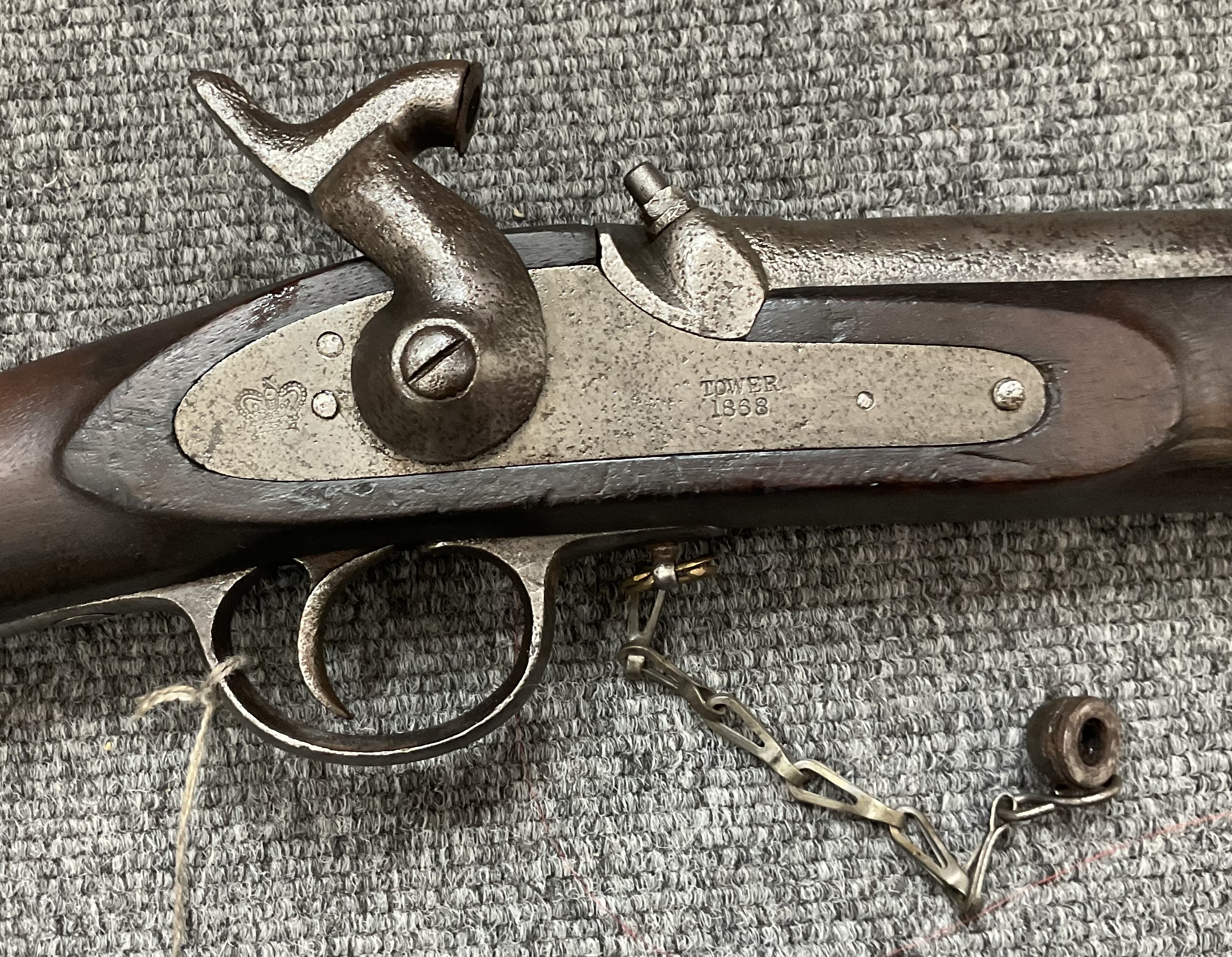 2-Band 31-inch smooth bored barrel. Lock engraved with crown over VR and TOWER 1868. Adjustable ladder sight, Steel ramrod.