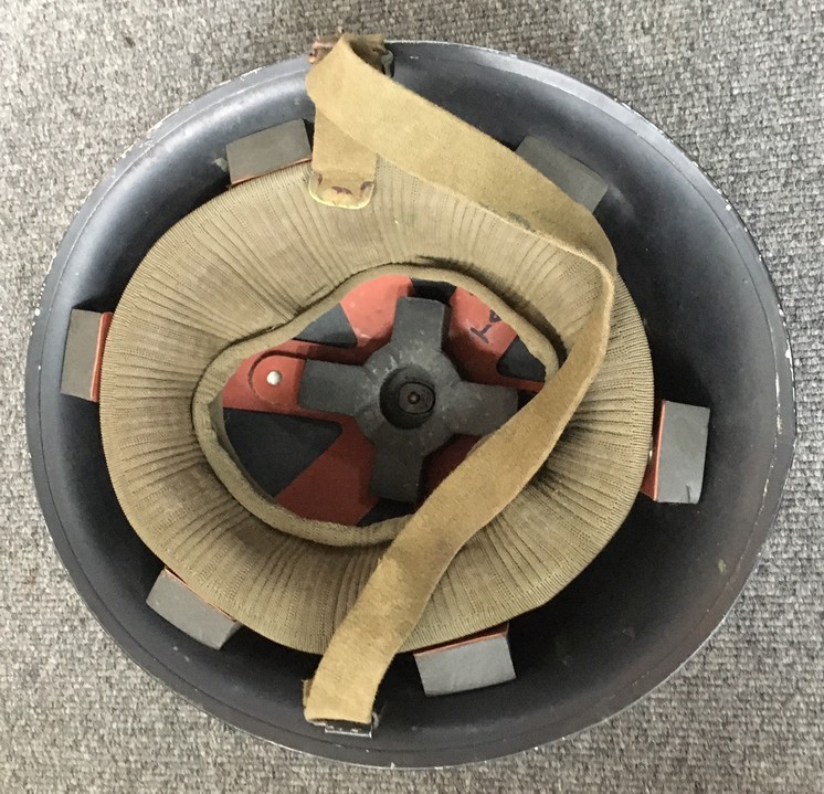 Leather liner. Chin strap with chin guard. Stamped CCL II 1952. With cover and netting.